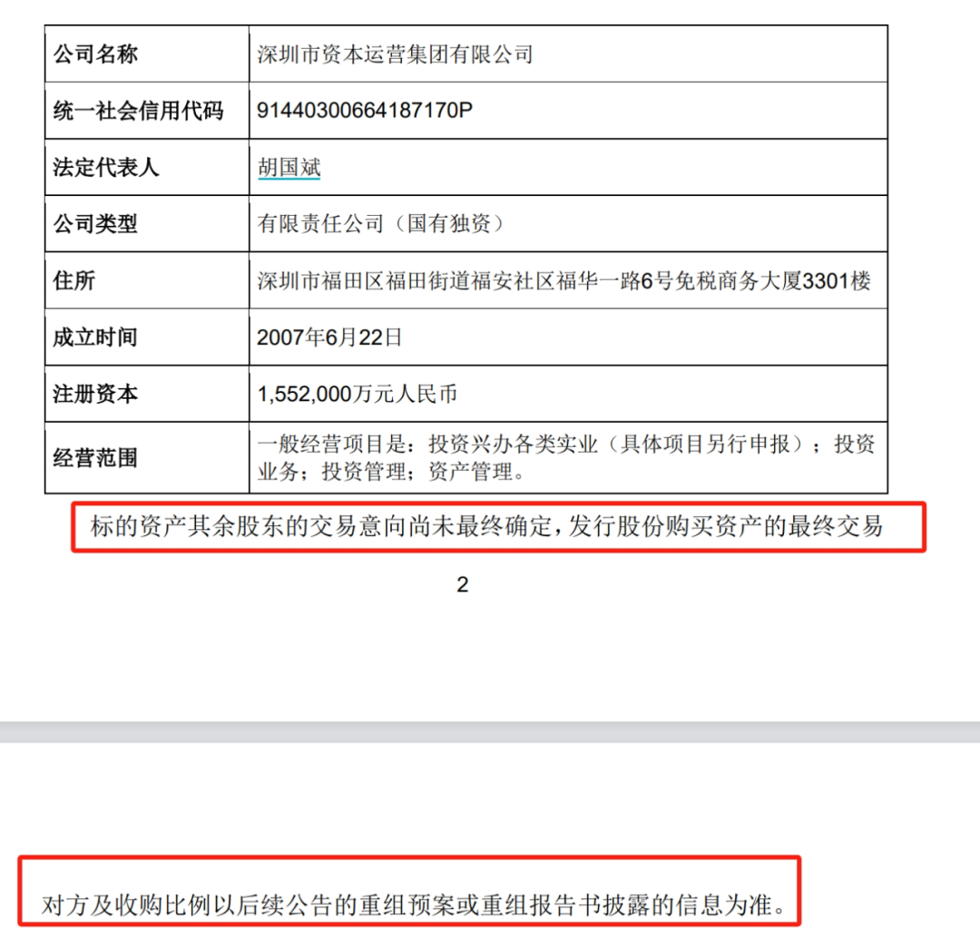 并且,8月21日,国信证券已经与深资本集团签署了关于本次交易的《意向性合作协议》,双方同意就本次重组的交易整体方案、交易方式等进一步协商,并在双方正式签署的发行股份购买资产协议中约定。