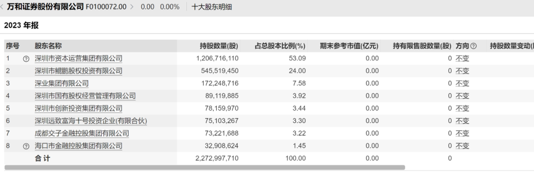 据Wind数据显示,万和证券共有8家法人股东,其中前3大股东分别为——深资本集团,持股53.09%;深圳市鲲鹏股权投资有限公司,持股24%;深业集团有限公司,持股7.58%。