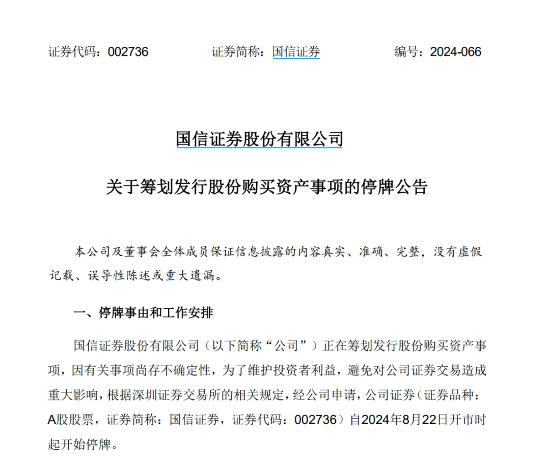 由于正在筹划发行股份购买资产,国信证券自8月22日开市时起停牌,预计在9月5日前披露交易方案,如果没能在此期间召开董事会审议并披露交易方案,最晚也将于9月5日开市起复牌。