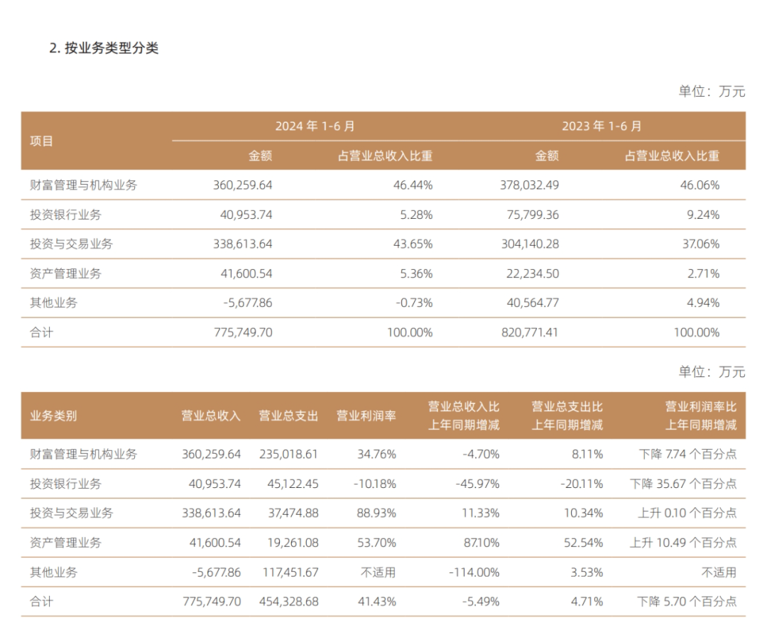 2024年上半年,国信证券2项业务出现收入下降——财富管理与机构业务收入同比减少4.7%;投行业务收入同比减少45.97%。