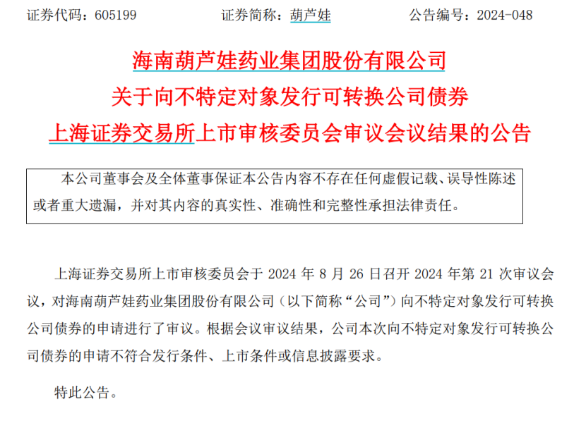 8月26日晚间,海南葫芦娃药业集团股份有限公司(简称“葫芦娃”)发布公告称,发行可转换公司债券(简称:可转债)的申请,因不符合发行、上市条件或信披要求而未获得上交所通过。