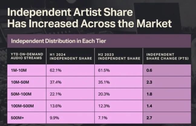 而在播放量超过5亿次的顶级曲目市场中,独立发行的歌曲市场份额为9.9%,相较于2023年下半年的7.1%,实现了2.7%的显著增长,增幅高达38%。