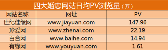 在线交友网站日均PV浏览量,世纪佳缘以147.96万的日均PV成为四大婚恋交友网站PC端的“赢家”,是排在第二名的珍爱网的七倍,成为用户进行在线婚恋交友的主流选择。其中有缘网的日均PV较低,仅1.61万。