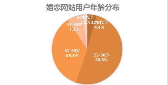 在线婚恋网站中超过半成的用户年龄集中于22-30岁,占50.8%;还有35.5%的用户年龄在31-40岁之间,这两个年龄区间以80、90后为主。作为互联网的主要用户群体,这部分年轻人更愿意通过在线婚恋平台进行婚恋交友,成为当下互联网婚恋市场的中坚力量。