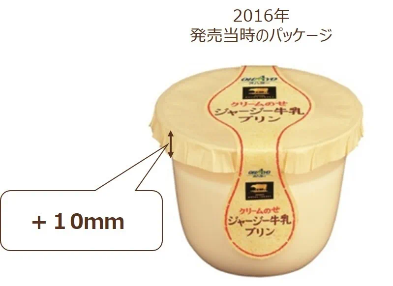 这证明了这款产品本身对消费者是有吸引力的,OHAYO开始了改进商品包装,让产品自己“说话”。研发负责人重新审视了商品包装后,在2016年推出了包装更有手作气息的娟姗牛奶布丁。[6]这款产品就像“没有”盖子一样,选用了类似和纸(日本传统纸张,手感好,产量低,价格相对较高)的包装材料,就像在专卖店售卖的手工制品一样以纸封口,“杯盖”的纸包装溢出杯口1cm将产品包裹起来。