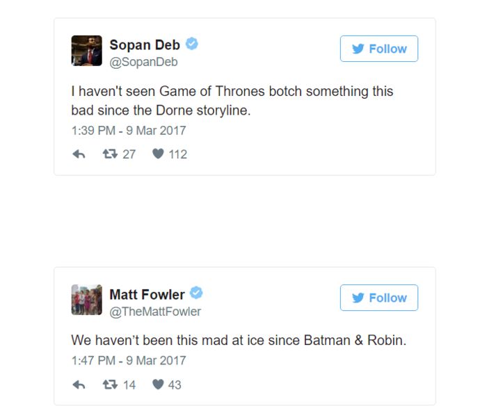 “自从多恩故事线后我还从未见过《权力的游戏》干过这么糟糕的事情。”一位名为Sopan Deb的网友评论道,而另外一些网友则表达了对冰块的烦躁感及厌恶感。