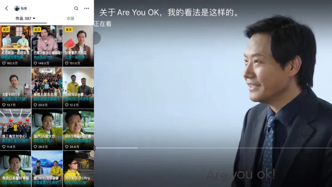 早在2019年7月,小米CC发布会当天,雷军就在抖音个人账号发布了第一支视频。2020年7月,雷军入驻B站,官宣入驻后的第一支视频,就是雷军回应B站出圈的“are u ok”鬼畜视频,可以说“网感十足”。