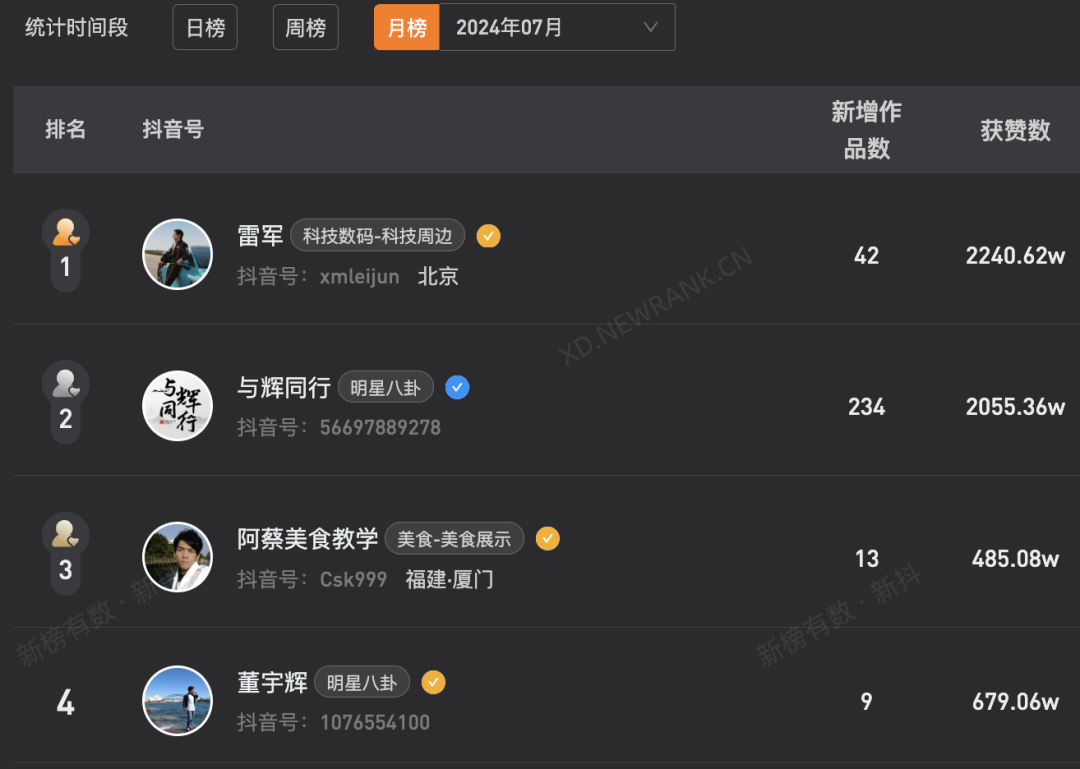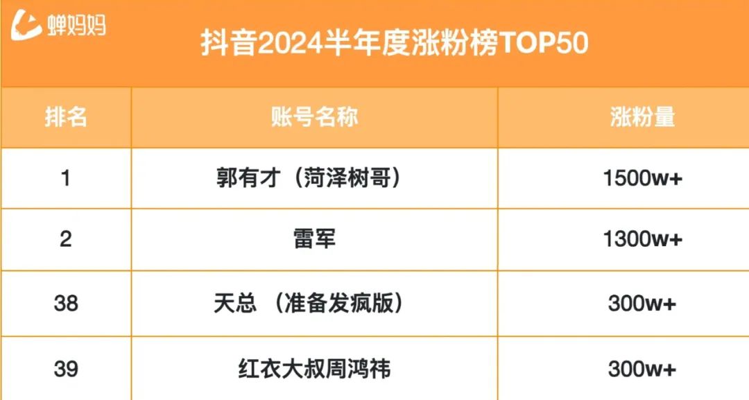 其中,雷军、周鸿祎最具代表性。据蝉妈妈数据,雷军、周鸿祎分别位于抖音2024半年度涨粉榜Top2和Top39,他们的成绩也不仅限于抖音。