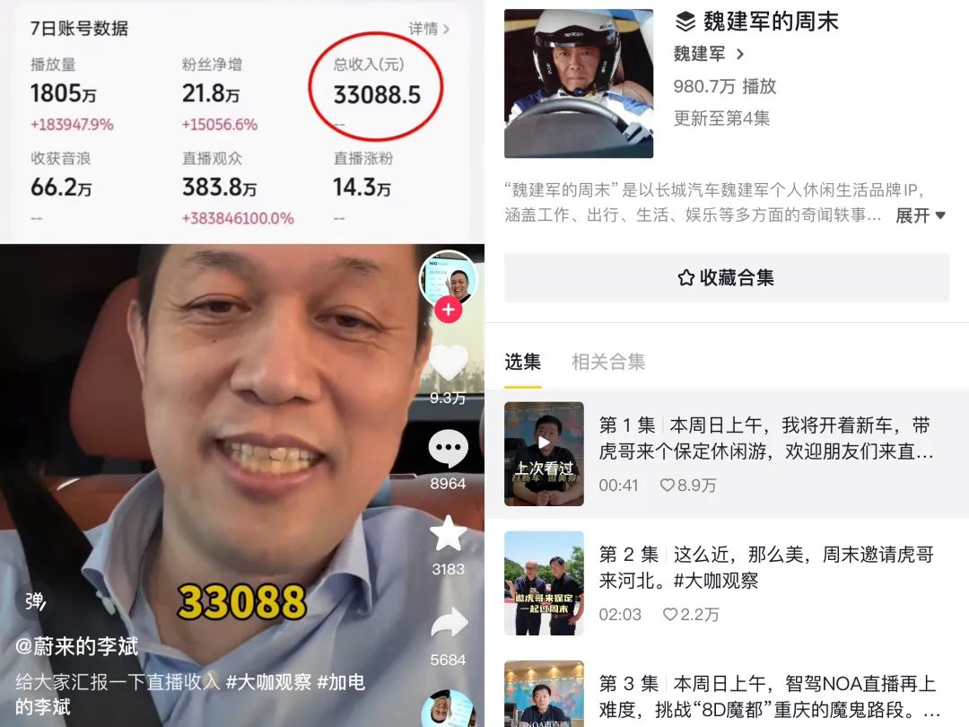 他的抖音账号里,合集“魏建军的周末”直接定位为魏建军个人休闲生活品牌IP,涵盖工作、出行、生活、娱乐等多方面的奇闻轶事。但自5月23日发布了第一条视频获8.9w赞后,该合集至今只更新了4集,平均点赞量不足2w。