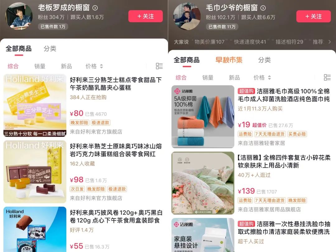 好利来二公子罗成通过“社恐老板”系列搞笑视频走红,洁丽雅三代继承人石展承以“闲置少爷”与归国二叔争夺家业的短剧《毛巾帝国》爆火,两人积累了足够的粉丝后,都开始给自家产品带货,这也是推动老牌企业年轻化转型的策略之一。在抖音商品橱窗,目前罗成挂了7件好利来产品,已售1w+,跟买数1.6w;石展承挂了14件洁丽雅产品,已售11w,跟买6.6w。