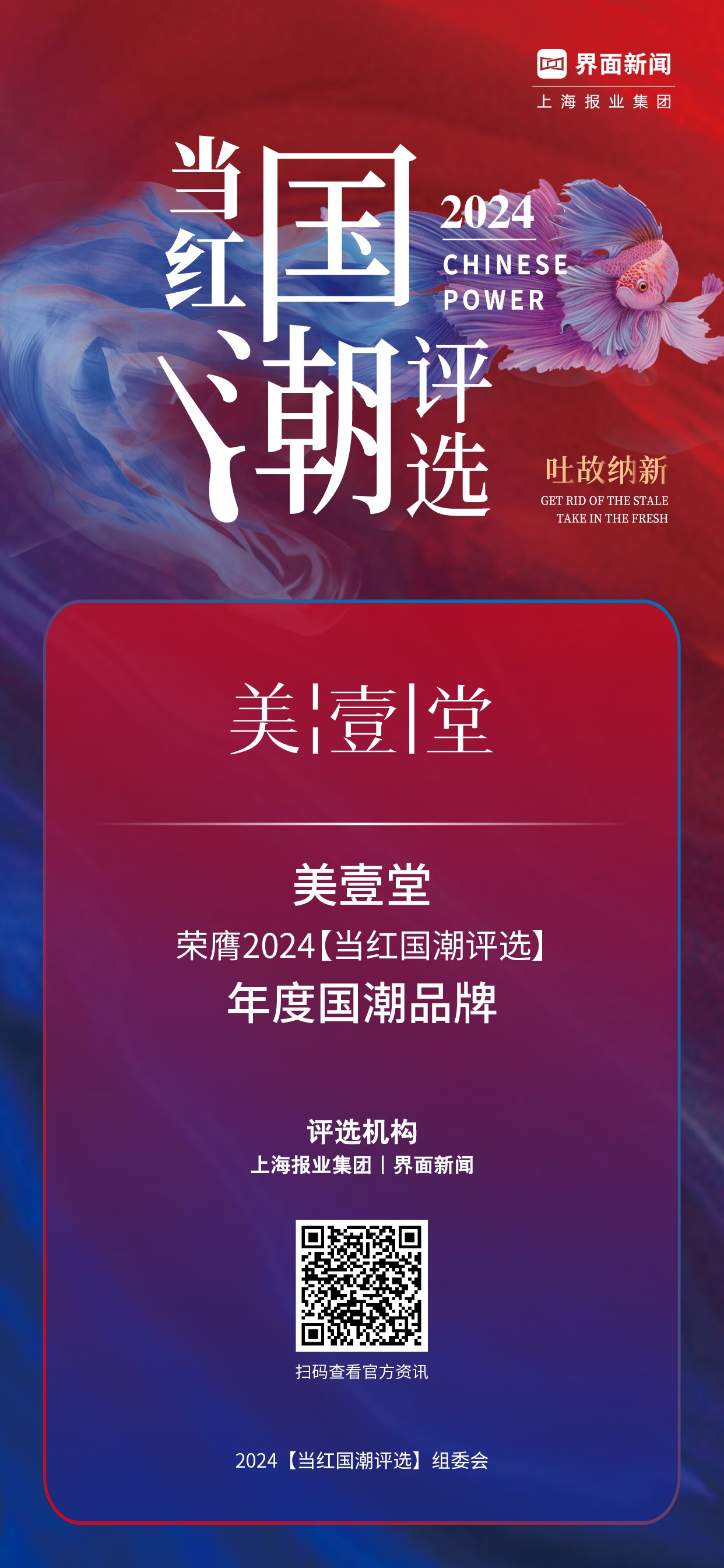 8月29日,上海报业集团|界面新闻主办的2024【新消费盛典】,正式公布了本届【当红国潮评选】获奖品牌。本次评选聚焦当红国潮品牌中彰显的中式美学多样的创新可能,通过表彰寻得激活古老文明生命力,重焕崭新光芒之有道良方。经过为期4个月的角逐,最终决出20家终榜得主。美壹堂凭借其文化初心的坚守和对国潮创新的引领荣获2024【当红国潮评选】年度国潮品牌。