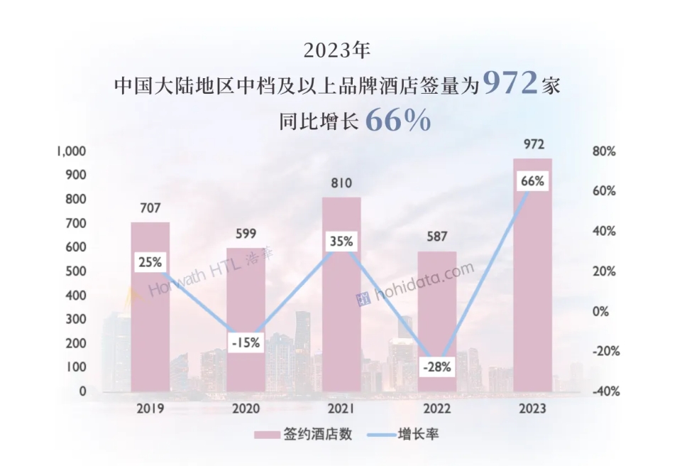 浩华数据显示,2023年全年,中国大陆地区中档及以上品牌酒店签约量显著回升,共签约972家,同比增长66%,创下近五年来的历史新高纪录。