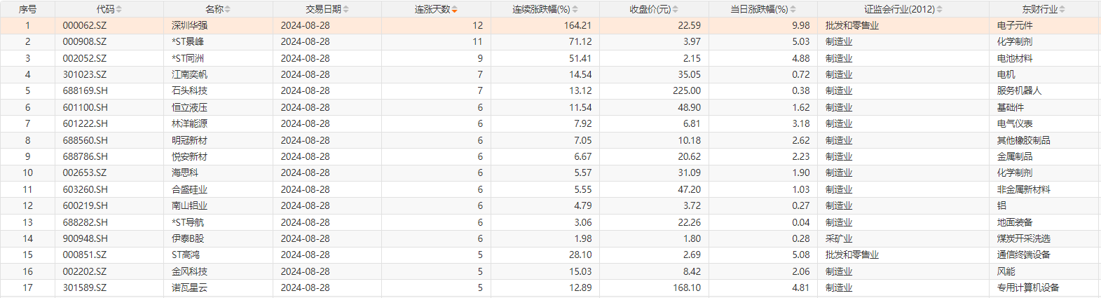 Choice数据统计,今日1只个股连续12天上涨,为深圳华强;1只个股连续11天上涨,为*ST景峰;此外,*ST同洲连续9天上涨;江南奕帆、石头科技2只个股连续7天上涨。