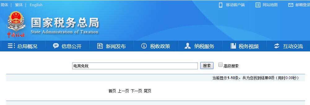 将“电商免税”作为关键词在财务总局网站上搜索,显示结果为0,这说明“电商免税”这一政策是不存在的,即使有,也只是国税系统内的不成文做法,并未落实到正式的法律法规上。