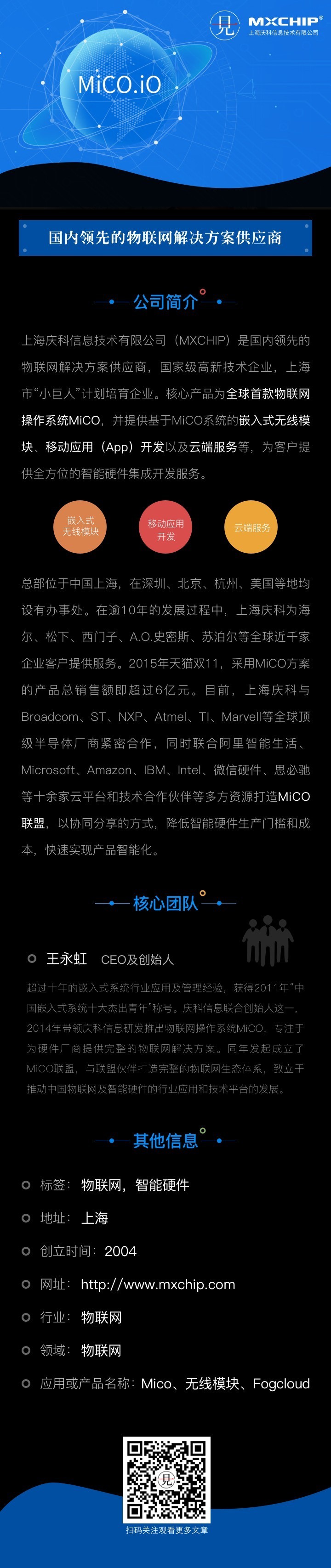 物联网正在如火如荼地向各个领域渗入,在物联网技术的支撑下,今后智能生活轻易可得。十余年来,庆科一直专注于智能硬件解决方案,提供高品质、低功耗的全系列嵌入式无线模块、并基于自主研发的MiCO物联网操作系统、移动应用(App)开发以及多选择的云端服务,为设备厂商提供全方位的智能硬件集成开发服务。