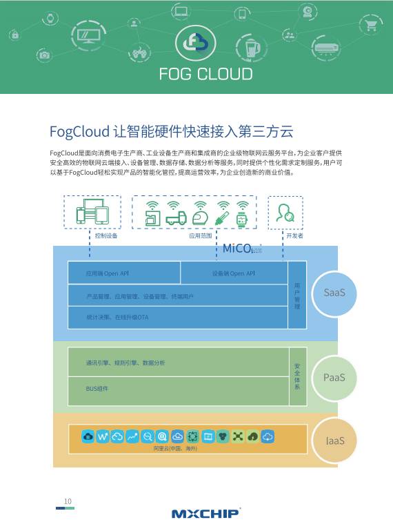 我们还做了一个产品叫FogCloud,是一个SaaS,基于阿里云,亚马逊云上的一个SaaS平台。设备是实时在线的,所以需要有效地去维护设备,更新设备的固件,更新设备的这些状态,设备系统的升级。所以,我们在2014年的下半年开始投入,组建了团队,做了现在的FogCloud,是基于我们的产品MICO和Fog,对于MICO和Fog的维护,升级,统计分析这样的一个后台管理。我们把它定义是我们整个产品的服务工具,我们定义是一个SaaS平台,是一个云计算顶层的服务平台。