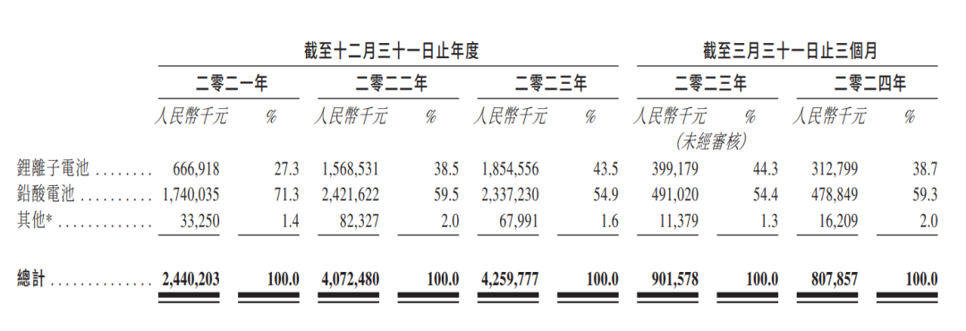 从产品划分来看,双登集团营收主要来自锂离子电池和铅酸电池。2021年、2022年、2023年及2024年第一季度,双登集团锂离子电池收入分别为6.67亿元、15.69亿元、18.55亿元及3.13亿元,收入占比分别为27.3%、38.5%、43.5%及38.7%;更重要的铅酸电池收入分别为17.40亿元、24.22亿元、23.37亿元及4.79亿元,收入占比分别为71.3%、59.5%、54.9%及59.3%。