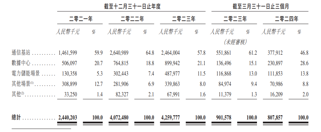 从应用场景上来看,双登集团电池产品主要用于通信基站、数据中心、电力储能及其他场景,其中来自通信基站、数据中心场景的收入的营收占比在8成左右。招股书显示,2021年、2022年、2023年及2024年第一季度,双登集团应用于通信基站和数据中心的产品收入占比合计为80.6%、83.6%、79.9%及75.4%。