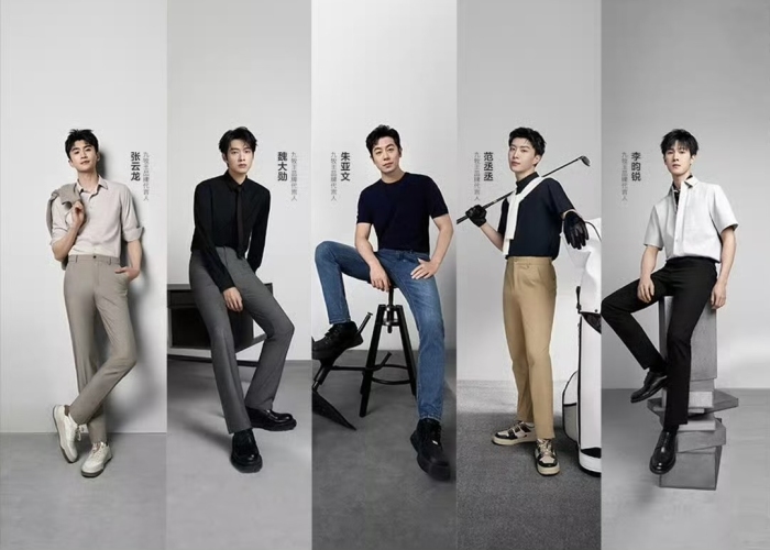 为了强化品牌形象、吸引新一代年轻消费者,九牧王品牌从2020年启动“男裤专家”战略变革,将裤子作为主打品类。2024年4月,品牌同时官宣了朱亚文、张云龙、魏大勋、李昀锐、范丞丞五位品牌代言人,来推广其“五裤”产品矩阵。这也是九牧王品牌时隔近五年再次启用代言人,在2019年前,其代言人一直为70后男明星陆毅。