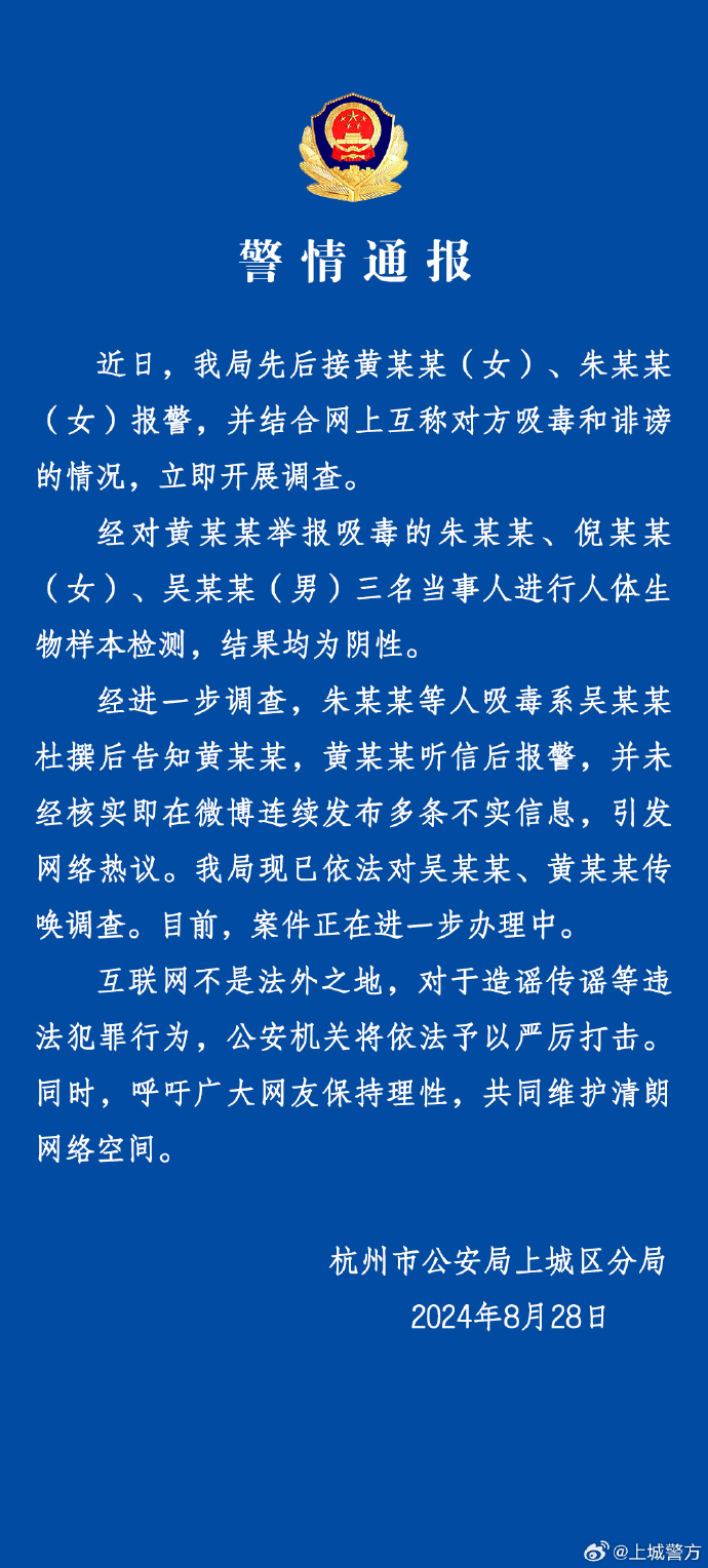 对此,杭州市公安局上城区分局8月28日晚发布警情通报称,近日,我局先后接黄某某(女)、朱某某(女)报警,并结合网上互称对方吸毒和诽谤的情况,立即开展调查。经对黄某某举报吸毒的朱某某、倪某某(女)、吴某某(男)三名当事人进行人体生物样本检测,结果均为阴性。经进一步调查,朱某某等人吸毒系吴某某杜撰后告知黄某某,黄某某听信后报警,并未经核实即在微博连续发布多条不实信息,引发网络热议。我局现已依法对吴某某、黄某某传唤调查。目前,案件正在进一步办理中。