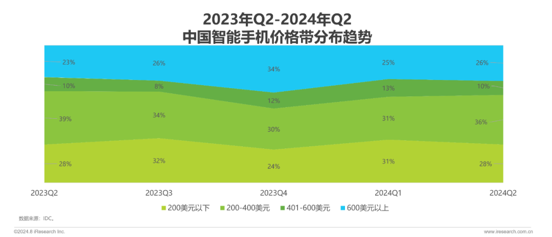 中国智能手机市场的整体增长瓶颈期仍在持续,且增长复苏不及预期,而随着消费者端换机预期周期不断拉长,行业对破局点的寻求也将更加紧迫。与此同时,中端消费者在购机方面同时出现了消费降级和升级的分化,但更多会选择体验更佳、配置更优的产品以期延长使用。据IDC数据显示,2024年二季度600美元以上高端手机市场份额同比增加近3%,而200-400美元中端价格带份额则同比对应下降近3%,侧面印证了高端市场增量空间开始释放。