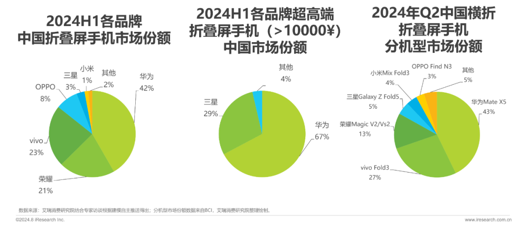 纵观2024年H1折叠屏手机市场,虽然头部厂商均已积累较多经验且竞争环境日益激烈,但作为产品线最早覆盖横折内折、横折外折、竖折全形态的厂商,华为仍旧强势领跑占据半壁江山,特别在1万元以上超高端市场中优势更为显著。分机型来看,华为Mate X5在23年发布后持续稳坐销售大热机型地位,及至今年二季度仍以超4成份额领跑细分品类。