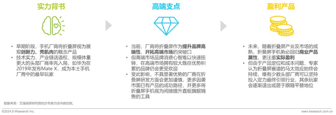 随着众多厂商卷入市场,折叠屏手机价位段开始出现多元化分布;但如果以厂商视角来看,可以发现折叠屏手机对各个品牌自身而言仍是绝对的高端线产品。行业专家也普遍指出折叠屏手机是品牌打造高端调性、突破高端市场的利器。但另一方面,囿于折叠屏手机的高端定位和相对更高的研发生产成本,这一赛道也注定是豪门引领,唯有技术、资本、客群三方面均有足够优势的厂商才能继续留在牌桌。