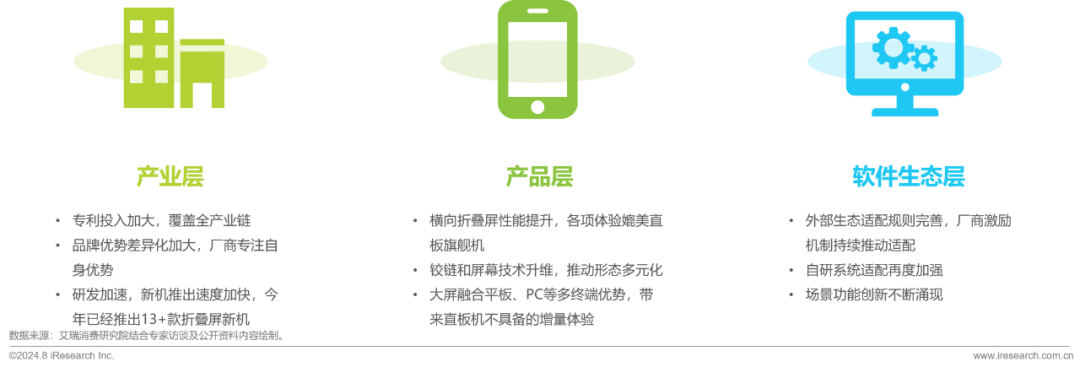 随着厂商对品类价值和定位的明晰化,折叠屏手机在事实上已经具备了走入成熟期的基础条件,而从产业、产品、软件生态三方面研判,也可以发现折叠屏开始进入成熟期的一些特征:产业角度看,头部厂商持续注重专利研发和产业链布局,新机推出速度不断加快;产品角度看,折叠屏手机性能参数已经媲美直板旗舰机,形态更加多元,而展开后的大屏则创造了更多直板机不具备的增量体验,更好满足用户不同场景需求,在使用体验层形成了升维超越;软件生态角度看,厂商与三方开发者密切联动推动适配,同时专注场景功能塑造。这些改变大大提升了折叠屏手机的用户体验,有助于在提升用户接受的同时更好展现品类的差异化优势。