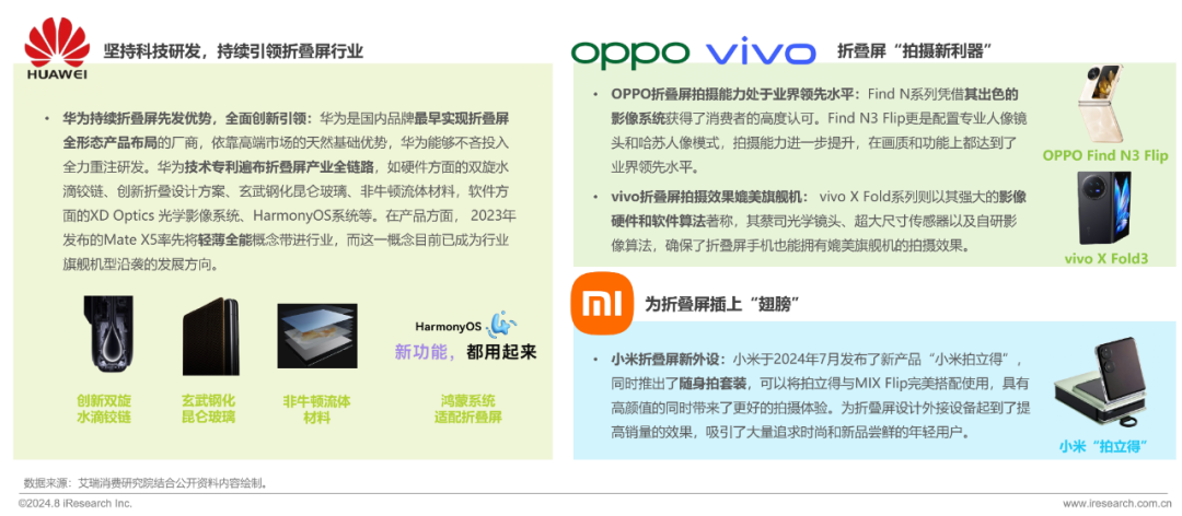 随着折叠屏手机市场的快速发展,品牌优势的差异化开始逐渐呈现。以华为为首的头部厂商持续加快专利研发和产业链的布局,持续引领折叠屏行业发展;OPPO、vivo、小米等厂商则聚焦自身现有优势,专注于提升手机的拍摄性能和优化产品类型。