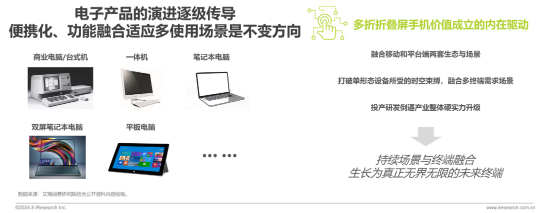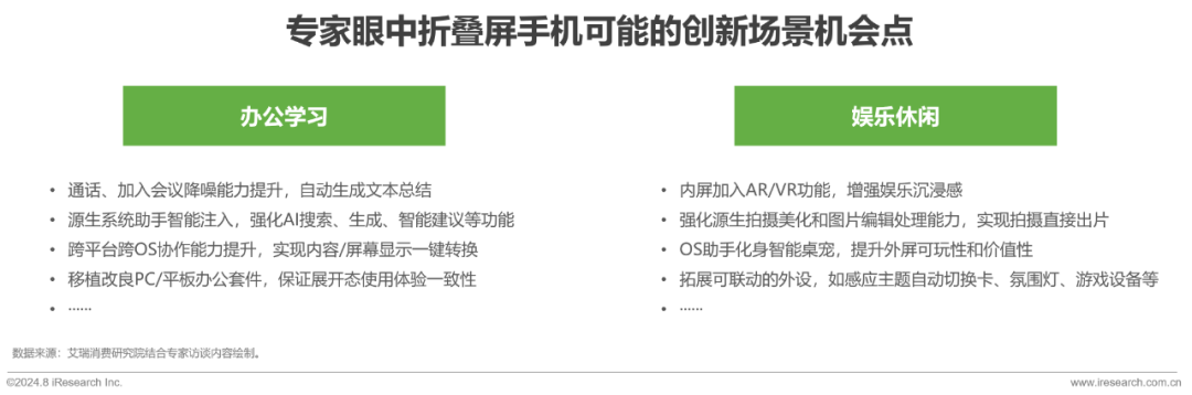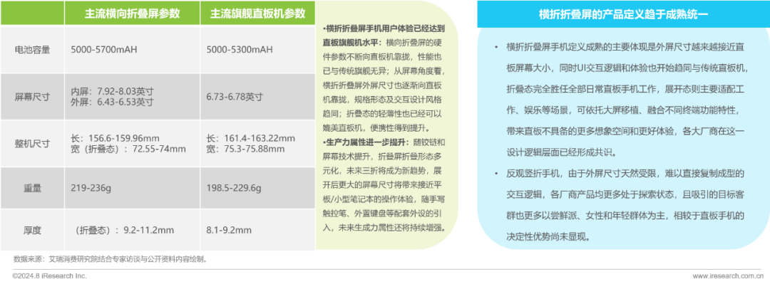 在头部厂商的持续引领和研发投入下,折叠屏硬件技术不断得到提升,手机的厚度、重量、性能不断向直板旗舰机水平靠拢,而展开后的大屏模式融合了PC、平板电脑等终端的体验与场景功能优势,轻薄且全能的生产力优势得以更好显现。从形态角度看,横折折叠屏手机目前行业的设计逻辑已经趋于一致,折叠态的使用体验也和直板手机差距不断缩小,除存量体验(性能配置和常规手机使用场景)与直板无异之外,还更好向用户传递了增量体验(融合终端与场景功能)的价值。