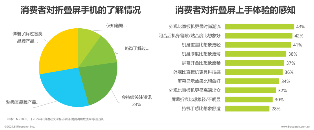 折叠屏手机当前的市场认知度已经达到较高水平,近8成消费者会持续关注资讯或更近一步详细了解产品情况。发展多年后,消费者仍保持日益增长的了解兴趣,这也侧面反映了折叠屏手机品类的市场接受度正逐渐打开。而从上手体验方面看,除了外观潮流、闭合紧密之外,机身轻薄也成为了新的惊喜点,更多用户发现折叠屏已经一改曾经笨重的姿态,观感体验越发接近直板。
