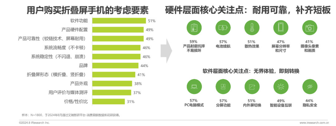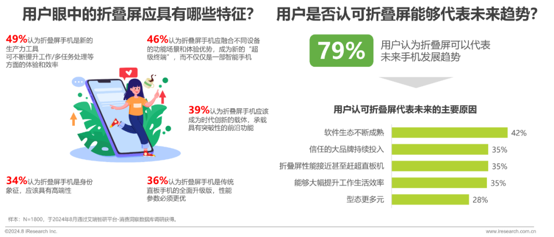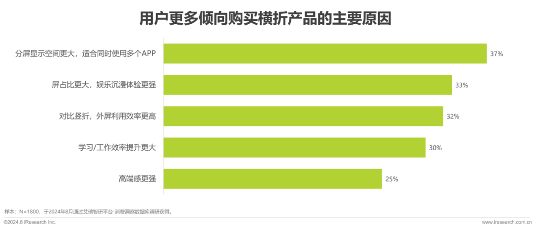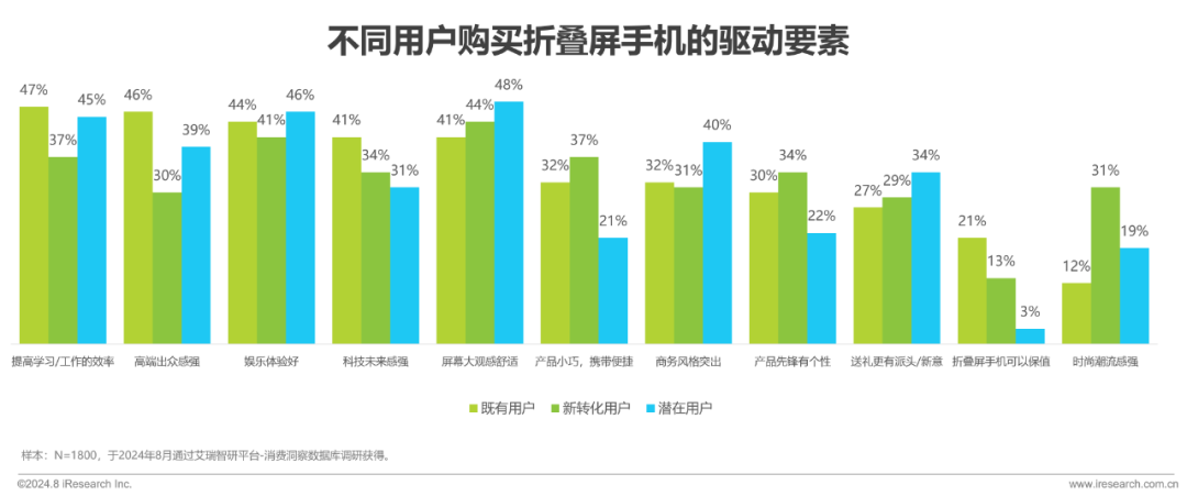 折叠屏手机大屏尺寸带来的生产力工具属性和更好的娱乐体验优势是吸引各类人群选购的核心驱动,但新转化用户和潜在用户更受时尚潮流感和送礼诉求的影响。