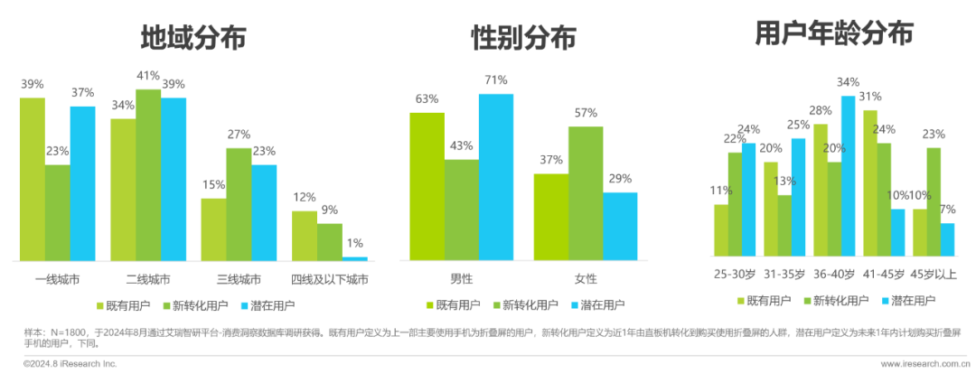 折叠屏手机整体市场渗透出现向更广域传递的趋势,虽然整体分布上仍是高线城市的中年男性群体作为消费主力,但新转化用户中,二三线城市和年轻、女性人群显著增多,这可能主要得益于折叠屏高端商务形象的感知吸引与近年竖折手机在时尚设计、拍摄场景方面的功能强化。