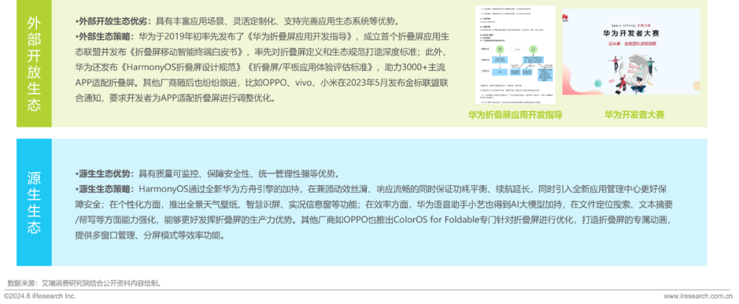 作为最早进军折叠屏领域的品牌之一,华为率先发布折叠屏应用规范,并持续引导折折叠屏生态开源;各家厂商纷纷跟进,共同支持开发者进行软件适配工作。在源生生态方面,各厂商也在安全、流畅、个性化、高效等体验方面不断强化。