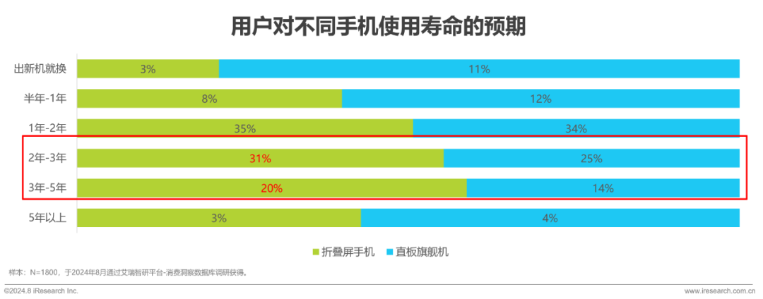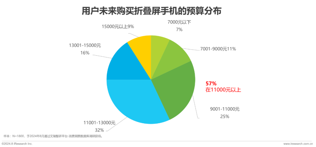 当前手机用户换机周期普遍拉长,折叠屏领域也不例外。用户对折叠屏手机的使用寿命预期相对比直板机更高,特别是预期换机周期在2-3年、3-5年时间段的用户占比显著更高;与之对应的是,用户也会选择适当提升预算追求更好性能配置,接近6成用户未来的折叠屏手机消费预算达到11000元以上。针对折叠屏手机品类而言,简单追求性价比已经不再是消费者的核心追求。