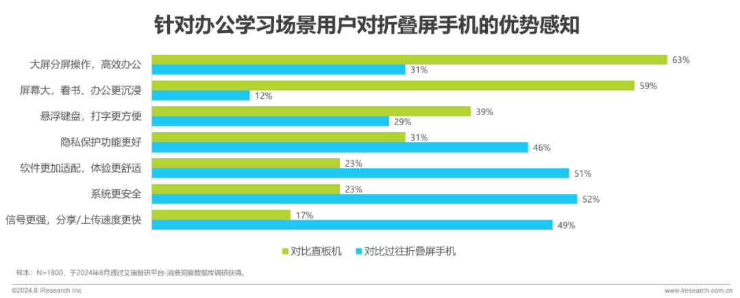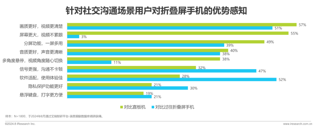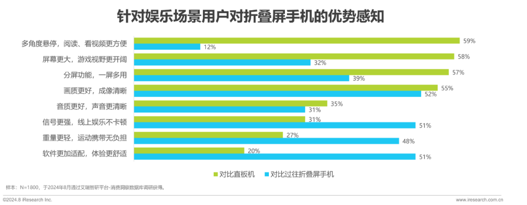 娱乐场景最能发挥折叠屏展开后的高沉浸感优势,同时可依靠悬停满足长时间使用,避免久持带来双手疲劳,也方便用户调整更健康的手机使用姿势。而分屏多任务处理也保证了休闲时光不会被轻易打断,因此这些方面对新转化用户的优势感知最为显著;对既有用户而言,除了信号更好、软件适配更优外,机身重量降低的优势感知也格外鲜明,这也从侧面表明折叠屏手机在娱乐方面已经初步实现了操作体验和轻薄便携的平衡。