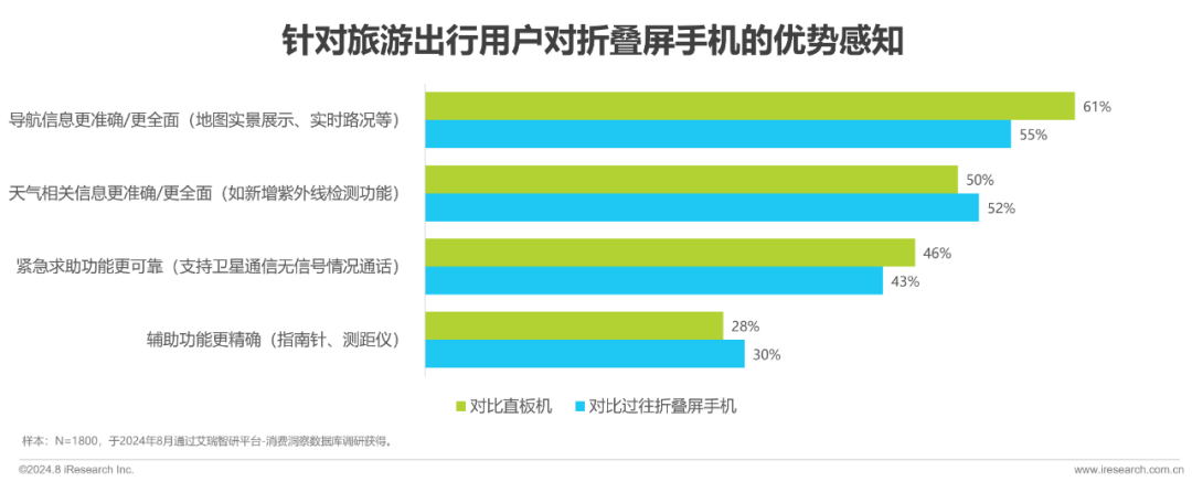 作为体现折叠屏双屏多态创新应用的一类场景,两类用户对当前折叠屏手机信息在旅游场景中信息展示的全面性、可靠性都有较强感知;目前折叠屏手机可利用外屏实现更多个性化的罗盘信息推荐、利用内屏呈现更高沉浸的全景内容展示,而手机本机也根据细分场景(如户外徒步通过紫外线检测提醒防晒防中暑、遇险可通过卫星通话紧急求助)搭载更多功能,全面提升了手机的实际场景应用价值。