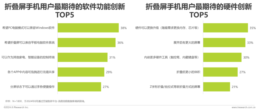 由于折叠屏手机已被用户广泛视为生产力工具甚至是集成超级终端,因此在软件层面希望可以更多兼容其他平台软件系统,实现多终端多设备物联操控,真正实现一机多用且可用;而在硬件层面,用户的新机使用寿命焦虑更凸显,虽然折叠屏更复杂的工艺决定了硬件随时升级可能不切实际,但厂商可从软硬件协同调校、提升资源有效利用率的角度回应用户期待,此外,配套硬件工具强化生产力也是当前新出现、呼声较高的用户诉求。