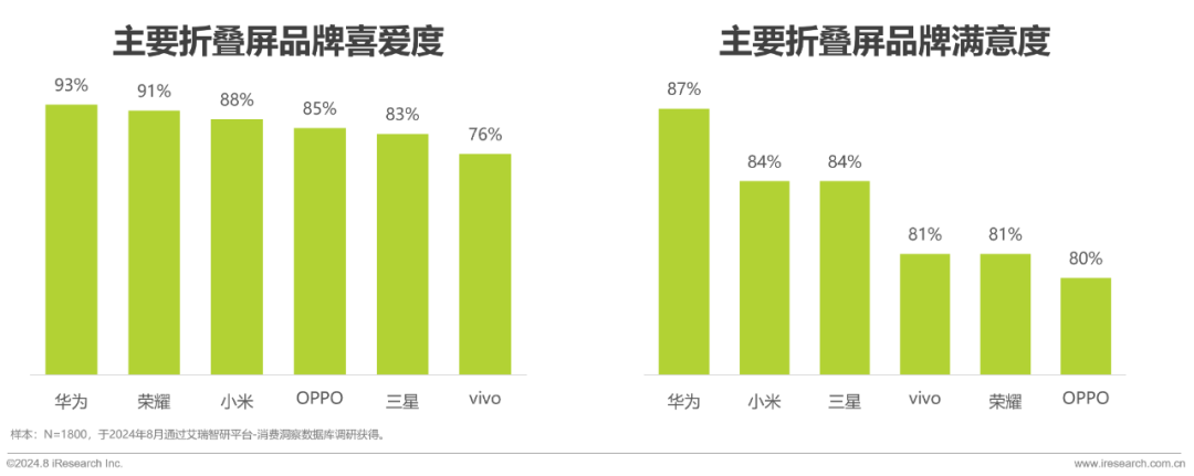 折叠屏品牌喜爱度方面更多受到品牌粉丝和情感加成,华为、荣耀、小米位列三甲;而品牌满意度方面则主要由产品体验驱动,华为、小米、三星作为率先入局者产品积淀相对更多,目前仍保持一定先发优势。
