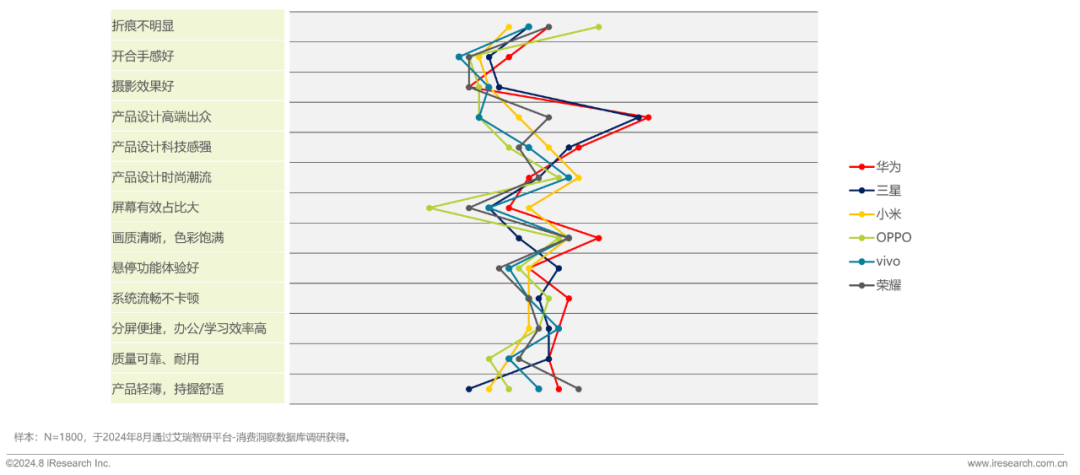 折叠屏品类定位决定了高端形象感知塑造是各厂商的营销重点,当前华为在高端感方面的感知仍领跑行业,除此之外,华为在产品画质、系统流畅、质量可靠方面的形象感知也表现突出。