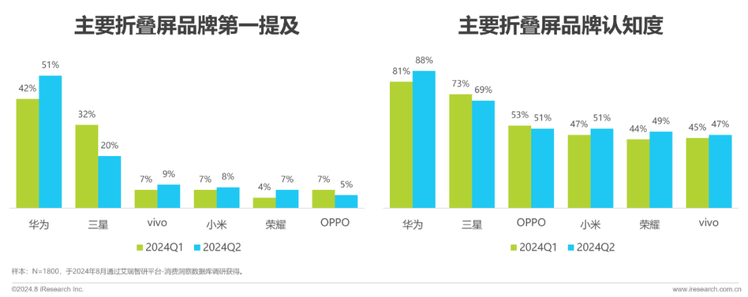 品牌心智角度华为与三星仍延续统治地位,特别华为在经过多款新机发布和一季度Mate X5热销带动的加持下,品牌第一提及与整体认知均有大幅上升,而三星心智表现则开始被其他本土厂商分流。