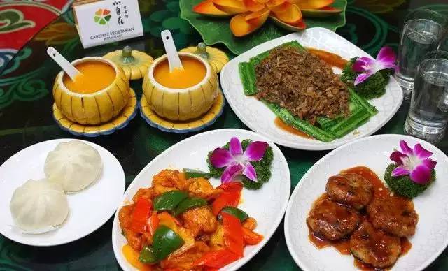 店里的招牌美食还有椰皇雪耳露、和合欢心、金缕玉带、淮山酿茄盒、生财有道(素丸)、泰式甜素扒、榴莲西米糕、南瓜盅、咖喱杂菜煲、香芒糯米饭等。如果你喜欢酸甜、辛辣的口味,这家泰式素食馆一定适合你。