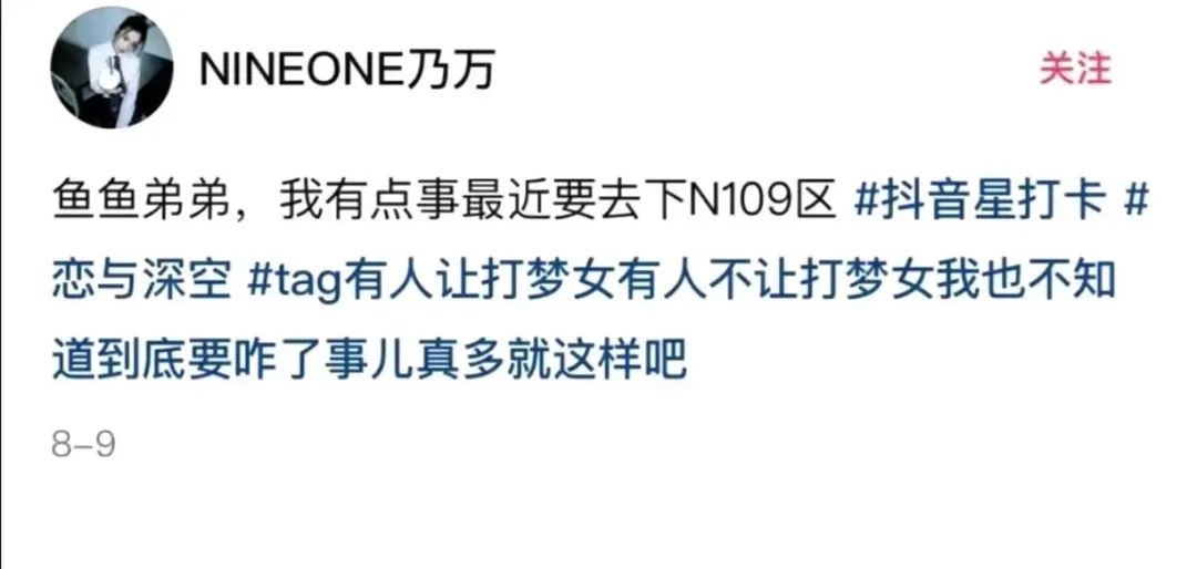 时间回到8月9日,乃万在抖音发布了自己的写真,配文是“鱼鱼弟弟,我有点事最近要去下N109区”。“鱼鱼弟弟”指的是叠纸旗下乙女游戏《恋与深空》中的角色“祁煜”。因为发言涉及“梦女向”,评论有玩家建议她补充#恋与深空#和#梦女#的标签。