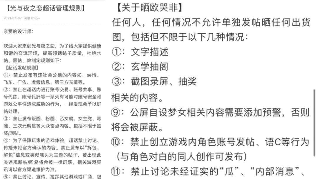 《光与夜之恋》的超话就有明确规定“禁止公开发布女主党/梦女向相关内容”的条例,“哭非晒欧”的帖子也不允许单独发布,而是会集中在同一条微博的回复当中;《世界之外》推出的活动“崩塌之界”刚上线时因为在排行榜中公开了玩家ID而被抵制,随后将ID改为星号显示。