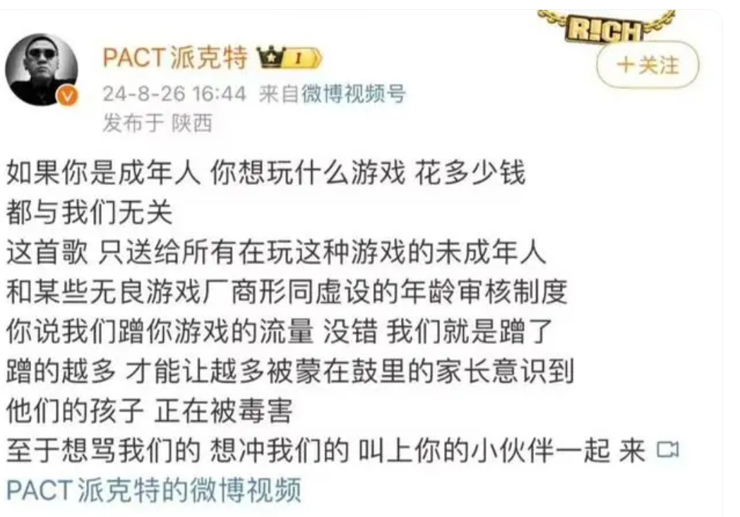 眼看乃万被乙游圈围剿,她所属厂牌NOUS UNDERGROUND的创始人派克特坐不住了。有beef就diss,这是哈圈的文化。8月26日下午,派克特发布diss曲视频,称“这首歌 只送给所有在玩这种游戏的未成年人和某些无良游戏厂商形同虚设的年龄审核制度”。