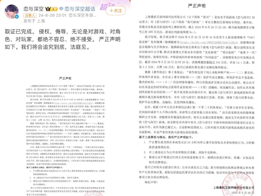 面对这样的指责,《恋与深空》在当晚11点发布声明,称派克特的行为侵害了公司的署名权、保护作品完整权、改编权、信息网络传播权以及名誉权。派克特在声明发布后,先是删掉原博,上传了一版没有《恋与深空》画面的黑底MV,随后在凌晨2点时删除了微博。