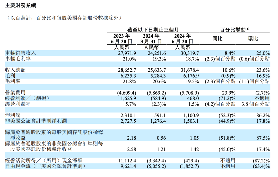 靠着全系降价与更便宜的 L6 车型,理想汽车二季度稳住了增长势头,比去年多卖了 2 万多台车、但总收入只增加了 10.6%,单车均价比去年低了 4.4 万,汽车毛利率降至 18.7%。净利润 11 亿元,相比去年同期减少了一半多。自由现金流连续两季度为负。