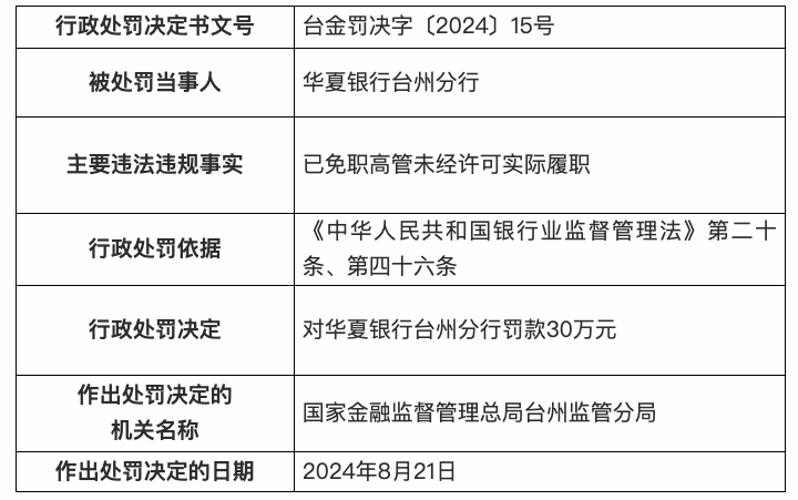 8月29日,国家金融监督管理总局台州监管分局行政处罚信息公开表显示,2024年8月21日,华夏银行台州分行因已免职高管未经许可实际履职,被处罚款30万元。