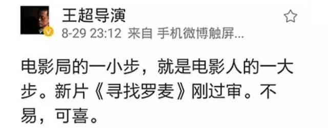 更加让人意外的是,前段时间,导演王超发布了一条微博称自己导演的同志题材电影《寻找罗麦》正式获得广电审批,意味着这将是内地影院上映的首部国产同志电影。王超在文中写道“电影局的一小步,就是电影人的一大步。新片《寻找罗麦》刚过审。不易,可喜。”