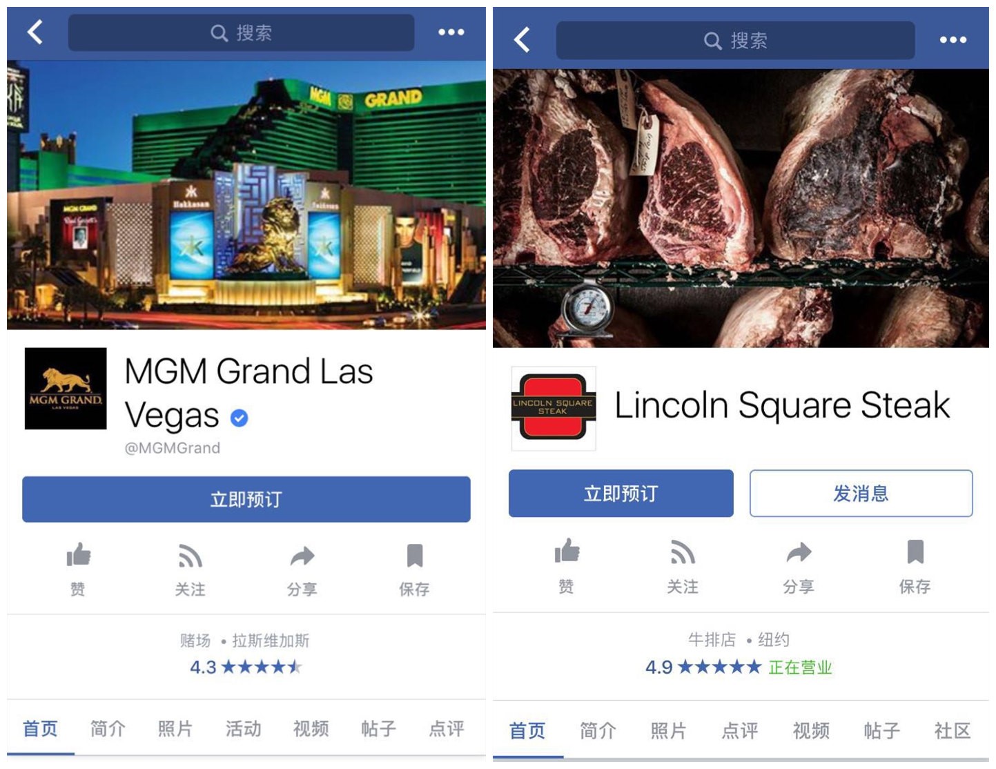 点开City Guides这个功能,你能看到一个城市清单,罗列着柏林、奥斯汀、旧金山、纽约等多个城市供游客点选。借助庞大的用户群和数据,这些城市的旅游资源大多被搜罗在功能项下,并且Facebook的消息和通话功能也被接入到这些旅游内容的提供商中,让游客可以很方便地与这些旅游项目取得联系,甚至有一些餐厅、酒店还能让你直接进行预定。比如你想去纽约的林肯广场牛排餐厅(Lincoln Square Steak)用餐,或者想去拉斯维加斯的美高梅大酒店(MGM Grand)度周末,只要点一下“立即预定”按钮,预约就可以轻松完成。